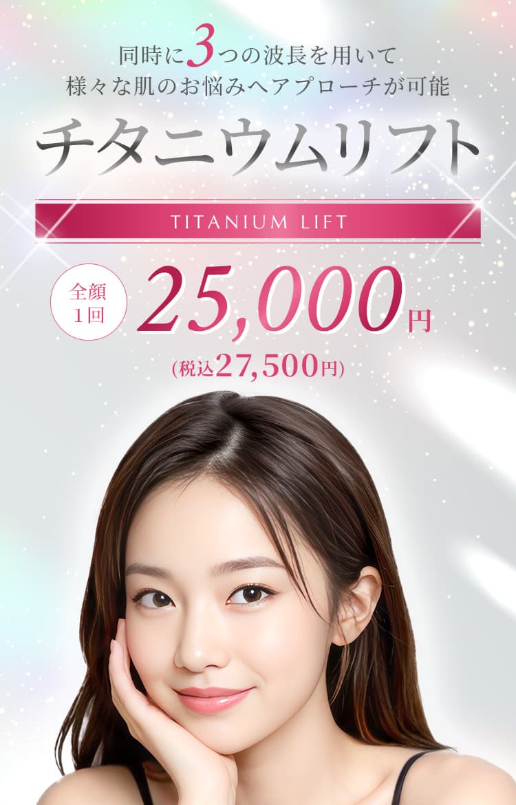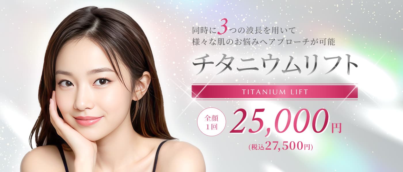 チタニウムリフトは、755nm(アレキサンドライト)・808nm(ダイオード)・1064nm(ヤグ)の3つの波長を同時に使用し、それぞれ異なる肌の層にアプローチします。浅い層から深い層まで熱を届けることで、肌を引き締める作用や、ハリを出すことなどが期待できます。